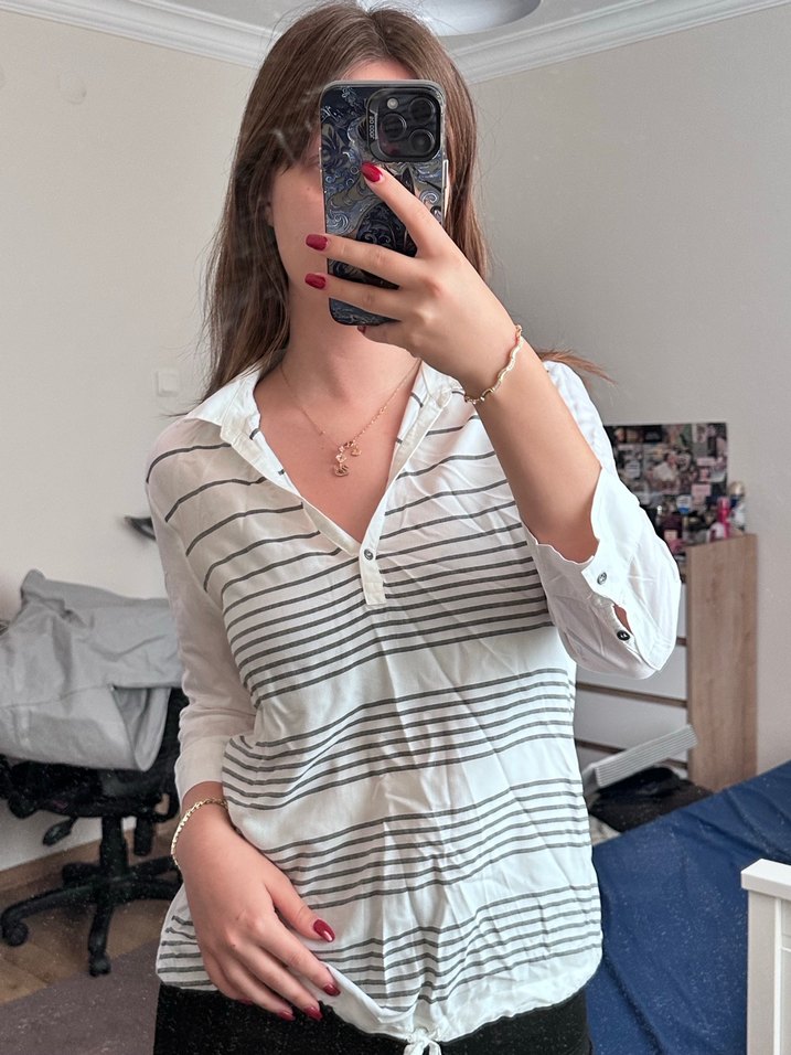 V yakalı, ara kollu, pamuklu ve düğmeli, beyaz zemin üzerine gri çizgili, rahat kesim kadın gömleği. Günlük sokak modası için uygundur. Mavi marka, Hiç defosu bulunmamaktadır.