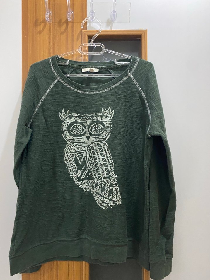 Yumuşak yün kumaştan, uzun kollu, bisiklet yakalı ve bol kesim, örgü gri kadın sweatshirt. Üzerinde baskılı baykuş deseni bulunur. Günlük kullanım için uygundur. M/38 beden ,defosu yok eskitme yapısı var gibi ,çok az kullanıldı