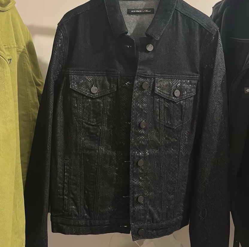 Düğmeli, yılan desenli siyah denim ceket. Normal uzunlukta, notched lapel yakalı ve uzun kolludur. Günlük kullanıma uygundur. Hiç kullanılmadı.S/M bedene uygun