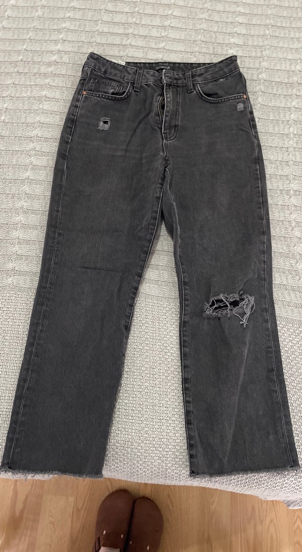 Siyah kırçıllı griye dönük renk, yırtık detaylı ve normal boyda, regular fit kot pantolon, günlük sokak stili için uygun.