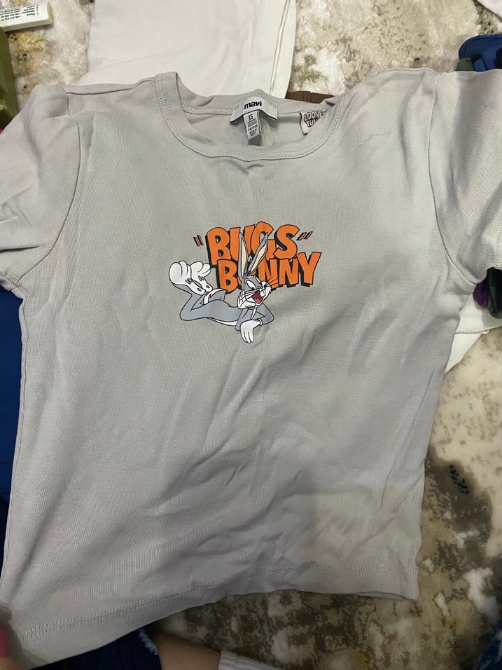 pamuklu, kısa kollu, gri renkli, Bugs Bunny baskılı, dar kesim tişört.