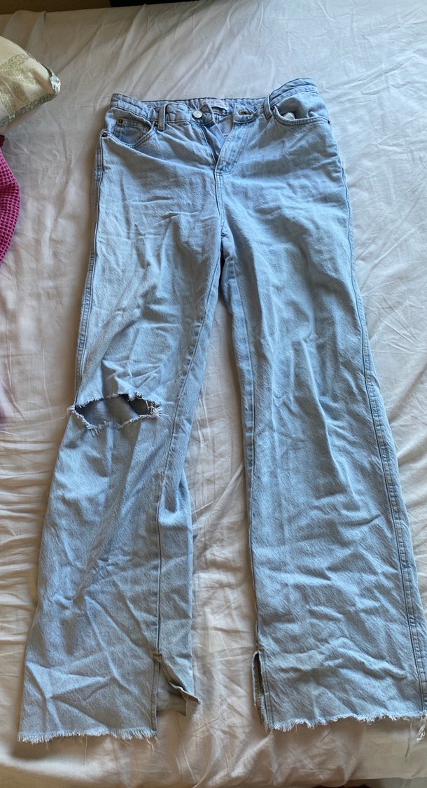 Açık mavi denimden yapılmış, bol kesim ve midi boy kadın kot pantolon. Yırtmaç detayı ve günlük kullanıma uygun normcore tarzıyla dikkat çeker.