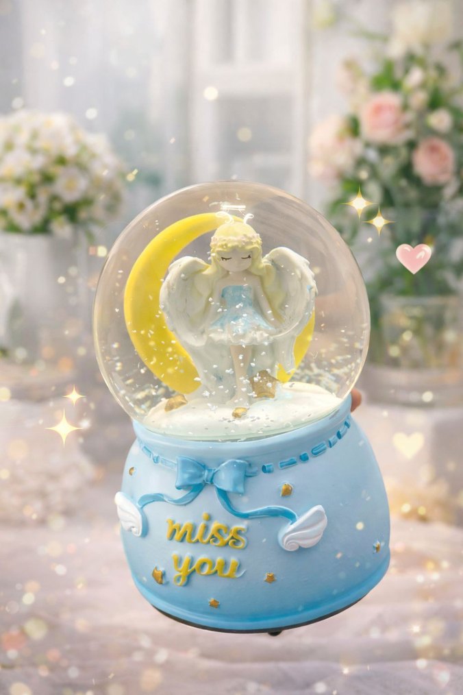 Renkli mavi kar küresi içinde ay üzerinde duran melek figürü. Tabanında fiyonk, kanatlar, yıldızlar ve "miss you" yazısı bulunur. Sevdiklerinize anlamlı ve duygusal bir hediye arıyorsanız, melek figürlü kar küresi tam size göre. Zarif tasarımı, yumuşak renk geçişleri ve romantik detaylarıyla hem dekoratif hem de özel bir anlam taşır. Öne Çıkan Özellikler: • Melek figürlü estetik tasarım • “Miss You” yazılı özel taban • Kar efektli cam küre • Dekoratif ve hediyelik kullanım için ideal • Ev, oda ve vitrin dekorasyonuna uygundur Doğum günü, Sevgililer Günü, yıl dönümü veya özel anlar için şık ve duygusal bir hediye alternatifi sunar.