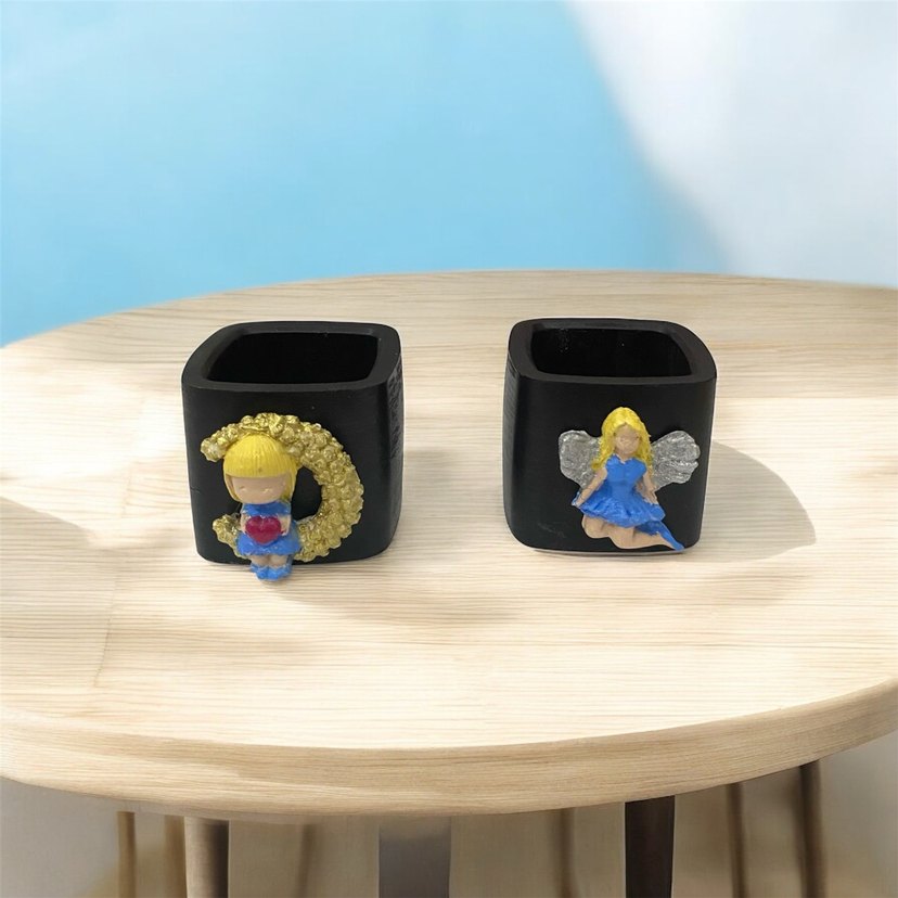 Altın detaylı mavi melek figürlü, siyah kare saksı seti. Dekoratif ve kompakt tasarım. Sukulent ve kaktüs saksısı olarak tasarlandı.