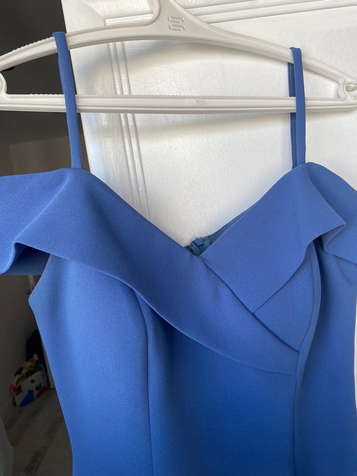 Bu mavi, mat kumaştan yapılmış, midi ve vücuda oturan abiye elbise, kayık yaka ve fırfır detayına sahiptir. Minimalist, çağdaş tarzda parti düğü için uygundur.