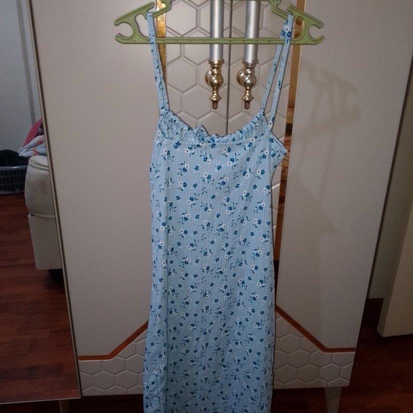 fırfır detaylı, kolsuz midi boy, ince oturan mavi bohem elbise. Yumuşak sentetik kumaştan, pastel tonlarda vintage tarzda.