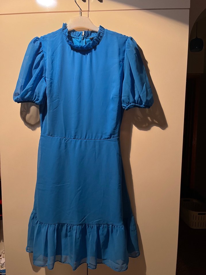 Fırfırlı detaylı, kısa balon kollu ve yüksek yakalı mavi midi elbise. Oturan kesimi ve yumuşak sentetik kumaşıyla renkli bohem tarzı sunar. Yanlış beden aldığım için hiç giyemedim.