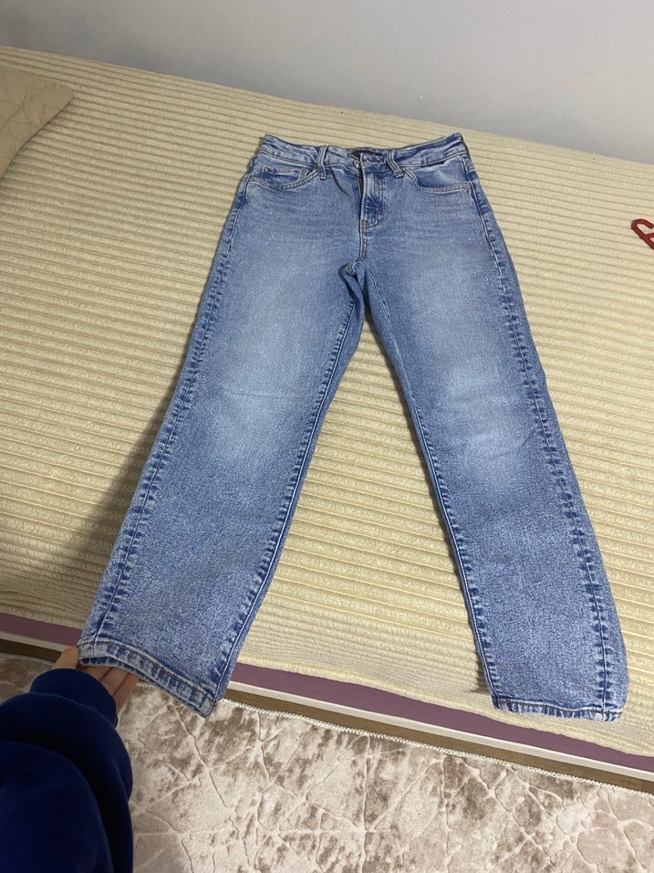 Mavi midi boy kot pantolon, normal kesim ve tokalı detaylı, günlük rahat kullanım için uygundur.