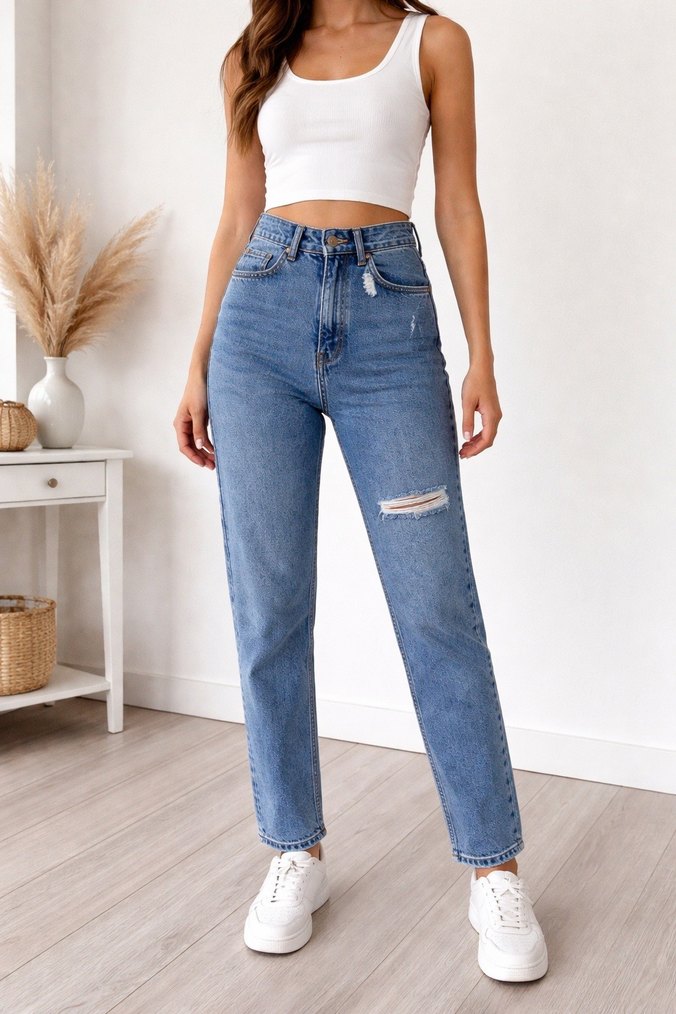 Bu açık mavi denim jeanler, normal kesim ve midi boyda, hafif yırtık detaylıdır. Rahat ve şık sokak stili için uygundur.