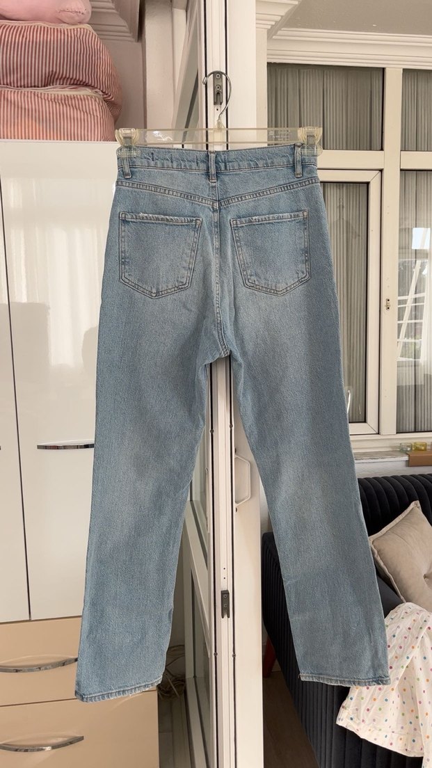Pastel mavi renkte, normal boy midi kesim, rahat kalıplı kadın denim pantolon. Günlük kullanıma uygun, sade ve şık bir tarz sunar.