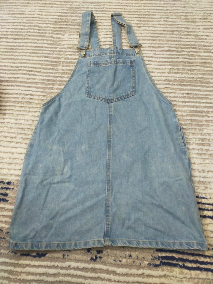 Bol kesim, askılı ve toka detaylı mavi kot kadın salopet. Midi boy, günlük kullanım için uygundur.