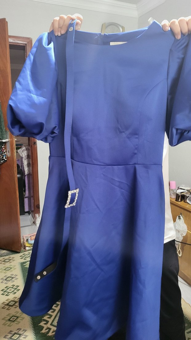 Mavi midi boy, parlak kumaşlı, tokalı kemerli, askılı kollu ve yuvarlak yakalı bol kesim kadın mezuniyet elbisesi. Düğün için uygun.