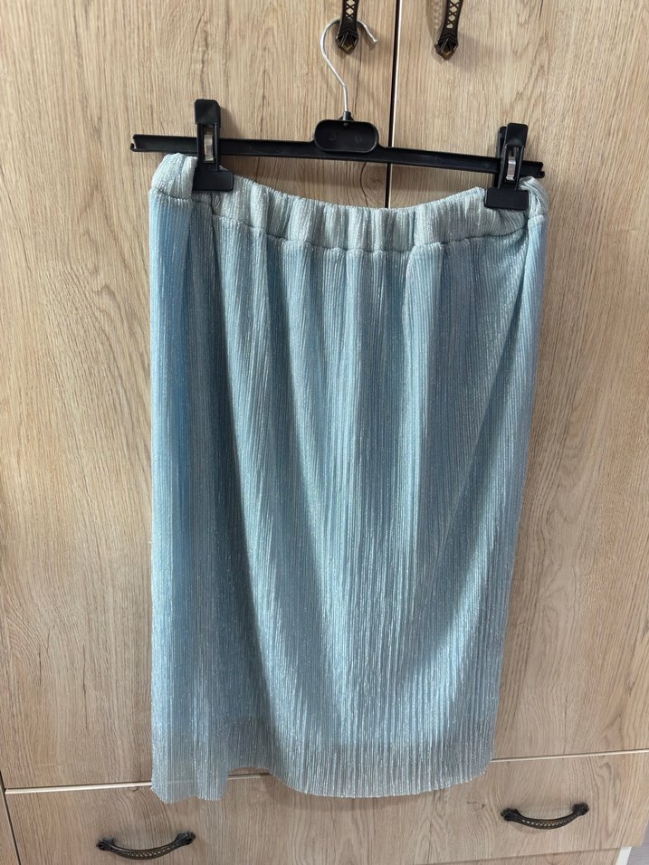Mavi midi boyda, pliseli ve bol kesim keten kumaştan yapılmış etek. Minimalist ve bohem tarzıyla evde rahat kullanım için uygundur. hiç kullanılmadı