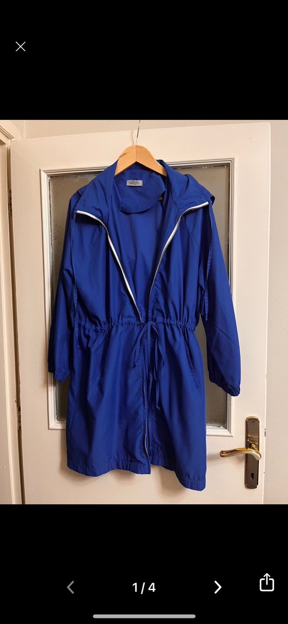 Mavi midi boy, rahat kesim, uzun kollu, yakalı ve fermuarlı yağmurluk. Parlak yüzeyiyle dış mekanlar için uygun, casual sokak stiliyle uyumlu. ️
