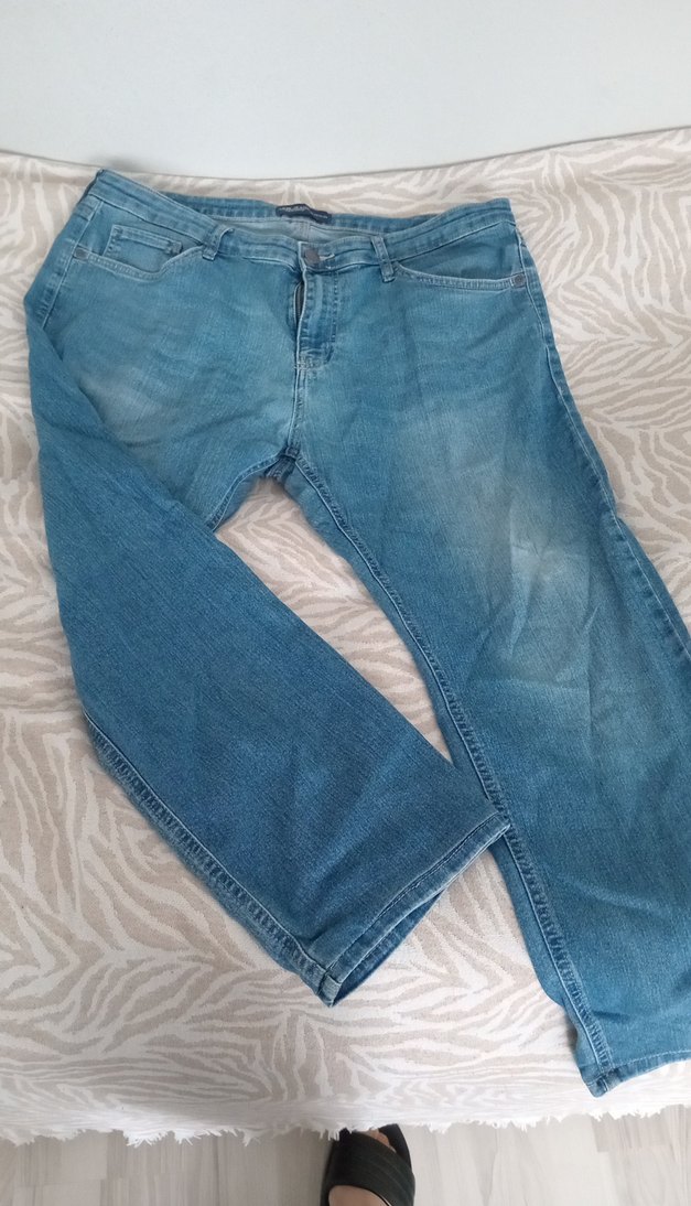 Parlak mavi renkte, midi boy ve salaş kesim denim kot pantolon, günlük kullanıma uygun rahat ve şık görünümlü.
