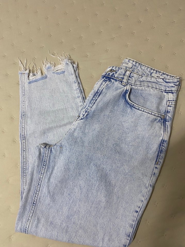 Salaş kesim, midi boy, pastel mavi kot kumaştan, kesik paça detayıyla günlük sokak stiline uygun kadın kot pantolon. temiz kullanıldı kusuru yoktur acil satılık