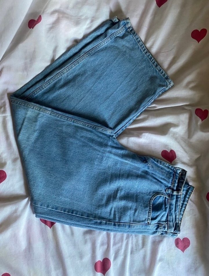 Salaş kesim, midi boy mavi kot pantolon. Günlük kullanıma uygun, rahat ve şık bir sokak stili sunar.
