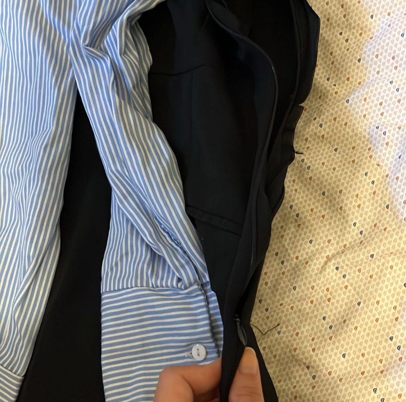 Koyu mavi renkte, notched lapel yakalı ve fermuarlı midi boy ceketi. Regular fit, uzun kollu ve günlük kullanım için uygundur.