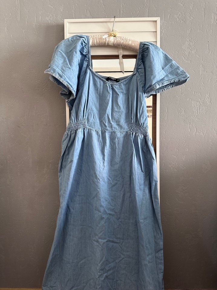 Mavi midi uzunlukta, kısa kollu, askısız yakalı ve bol kesim drapeli denim elbise. Yumuşak kumaştan, günlük kullanıma uygun bohem vintage tarzı.
