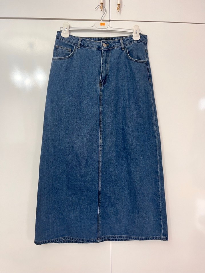 Mavi renkli, midi boyda, bol kesim denim etek. Minimalist ve normcore tarzıyla günlük kullanıma uygun, sade ve desen içermeyen tasarım. Moda nisa dan almıştım hiç giymedim