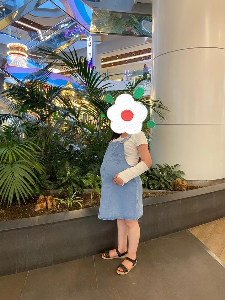 Mavi pastel tonlarda, bağlama desenli, normal boy, vücuda oturan denim hamile elbisesi. Minimalist ve normcore tarzıyla rahat ve şık.