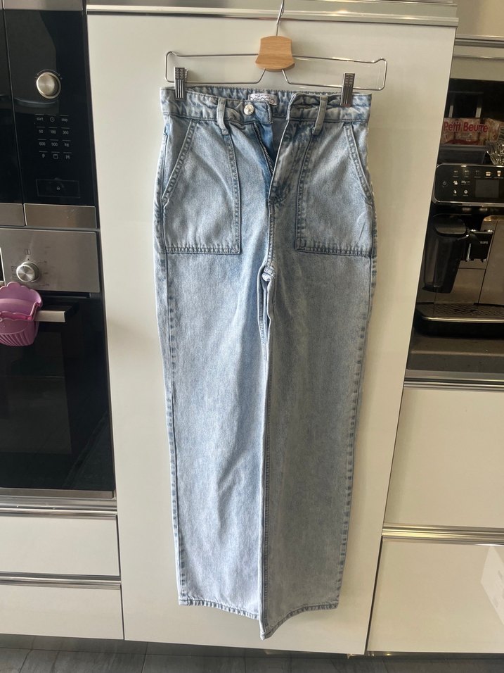 Pastel mavi tonlarında salaş kesim, bel detaylı denim pantolon. Temiz üründür kusuru yoktur bel 32 boy 107 cm