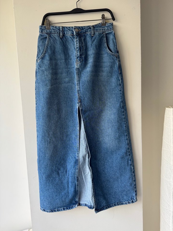 Mavi midi denim etek, salaş kesimi ve ön yırtmaç detayıyla rahat ve şık bir görünüm sunar. Günlük kullanım için uygundur.