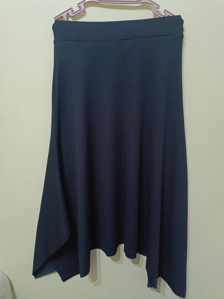 Mavi midi boyda, drapeli ve bol kesim kadın eteği, yumuşak sentetik kumaştan üretilmiştir. Minimalist ve normcore tarzıyla günlük kullanıma uygundur.