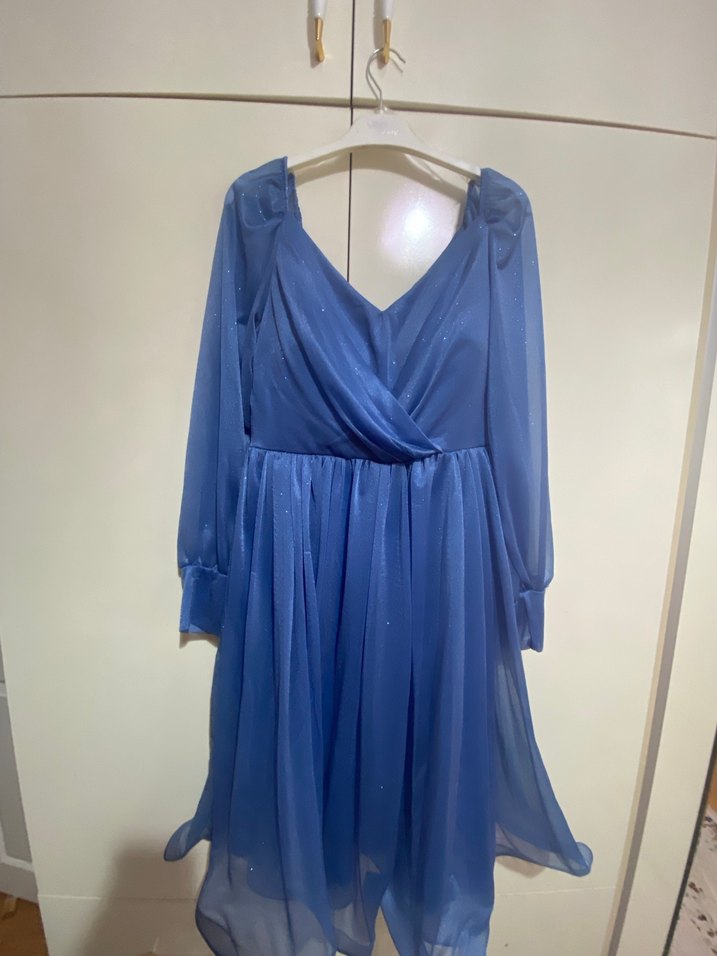 Parlak mavi midi elbise, drapeli tasarımı, bol kesimi ve uzun kollu. V yaka ve minimalist tarzda, parti için uygun.