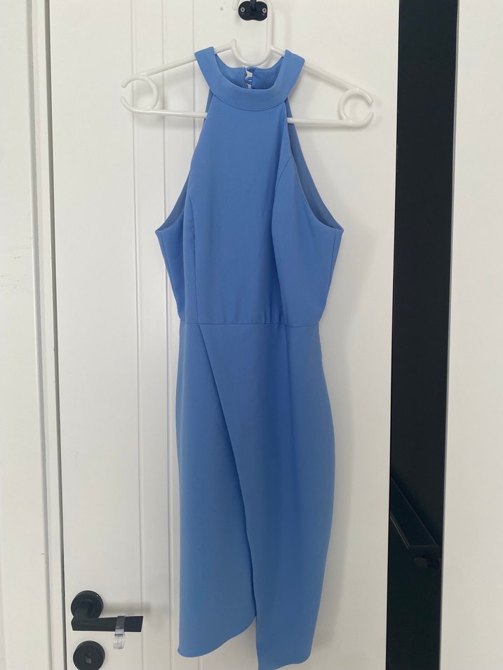 Kolsuz, mavi midi elbise, yüksek yakalı ve vücuda oturan kesime sahiptir. Şık drapeli detayları minimalist ve çağdaş tarzda, ofis kullanımı için uygundur. S-M uyumlu sadece bir kere giyildi. Kusuru yoktur
