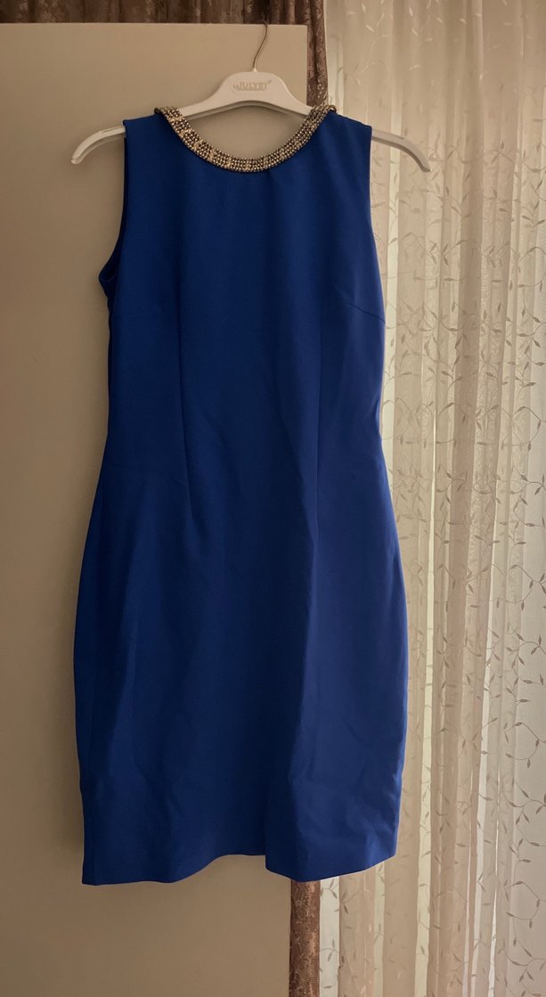 Mavi, parlak kumaştan, yüksek yakalı ve kolsuz, drapeli, vücuda oturan midi elbise.