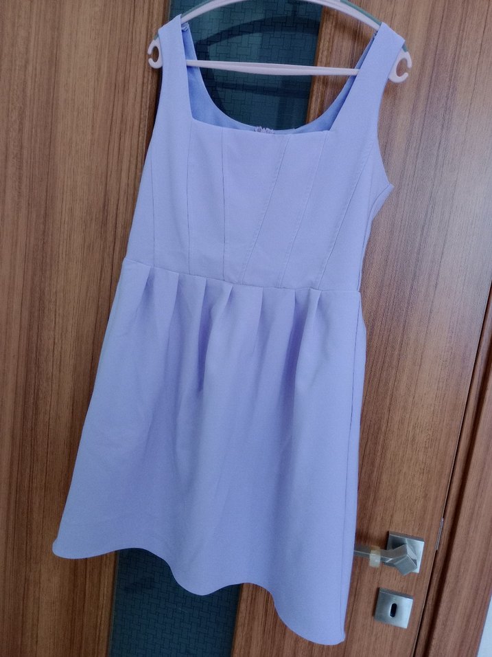 Pastel mavi renkli, kolsuz ve askılı elbise.Pileli ve bol kesim, sentetik kumaştan üretilmiştir. Günlük kullanıma uygun minimal tarzda.