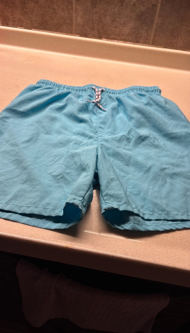 Rahat kesim, pastel mavi midi yüzme şortu. Plajda ve günlük sokak stilinde kullanıma uygundur.