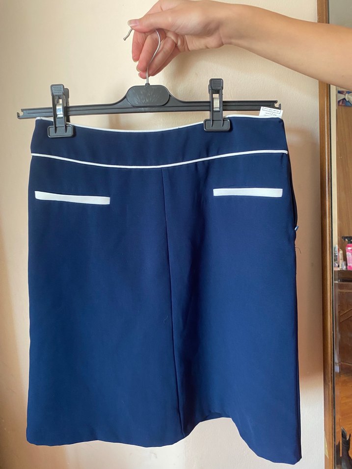Mavi midi uzunlukta, kemerli eteği. Sentetik kumaştan, parlak yüzeyli, ofis için uygun sade ve desen içermeyen tasarım. Cep kenarlarında beyaz detaylar bulunur.