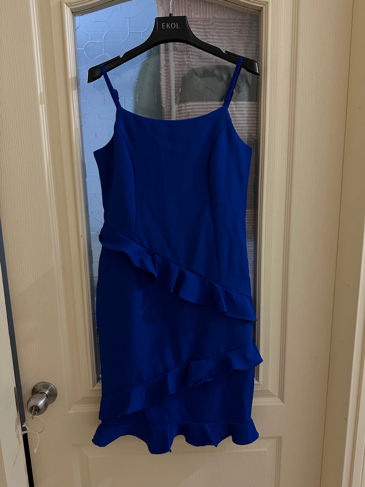 Mavi, askılı, midi boy, fırfırlı detaylı, kolsuz ve sade desensiz, parti için uygun şık elbise.