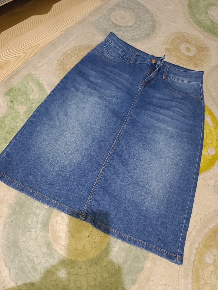 Gevşek kesim midi boy mavi kot hamile eteği. Günlük kullanım için rahat ve şık, desen içermeyen sade tasarım.