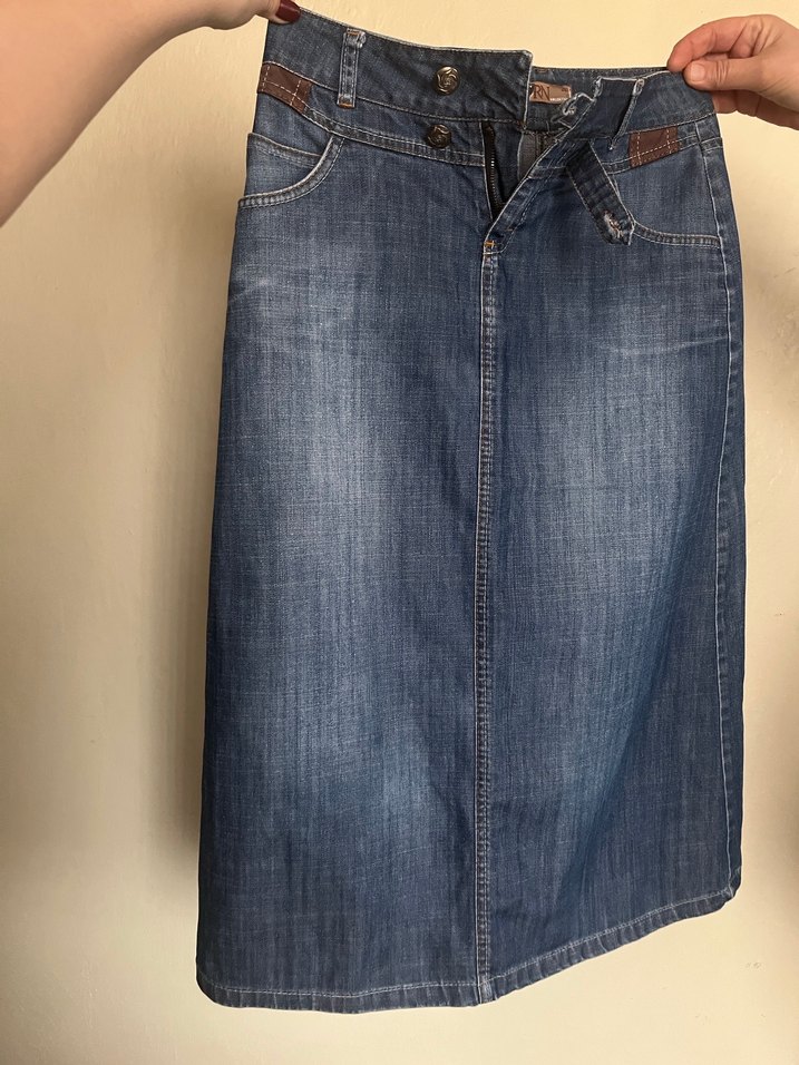 Mavi renkte, kemerli, bol kesim hamile kot midi etek, günlük kullanıma uygun normcore tarzda.