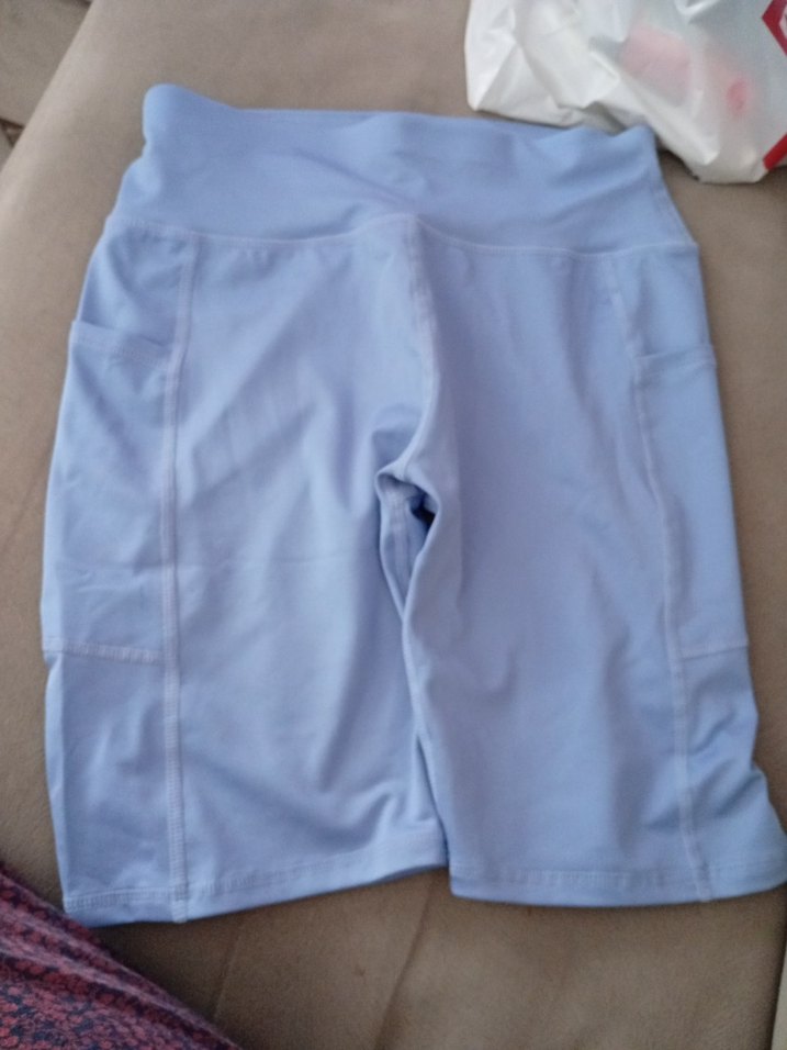 Pastel mavi renkli, sentetik kumaştan yapılmış, midi boy, dar kesim hamile spor şortu, rahat ve şık bir görünüm sunar.