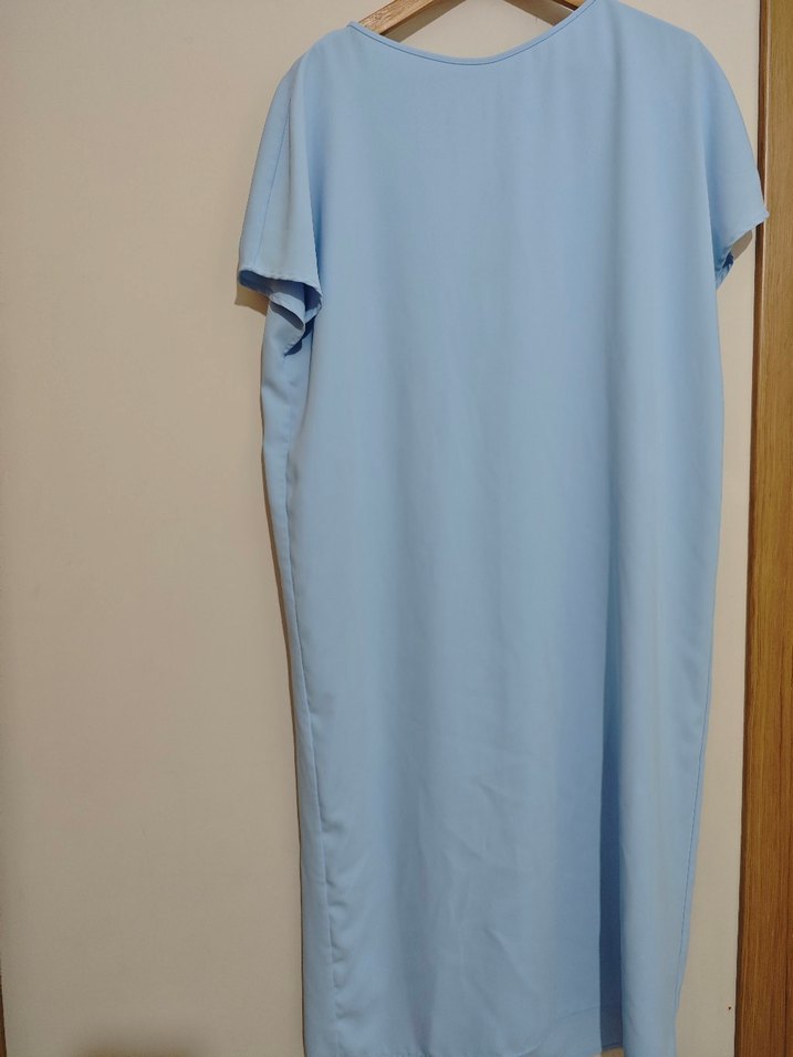 Pastel mavi renkte, kısa kollu, yuvarlak yakalı, salaş kesim midi tunik. Yumuşak sentetik kumaştan, günlük kullanıma uygun drapeli tasarım.