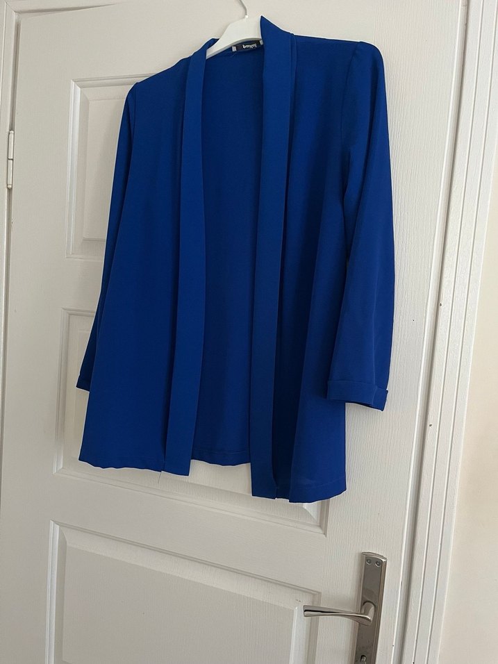 Bu kadın ceketi, koyu mavi renkte, drapeli ve kesik yakalıdır. Uzun kollu, normal kesim ve sentetik kumaştan yapılmıştır. Ofis için uygundur, minimalist ve desensiz tasarıma sahiptir.
