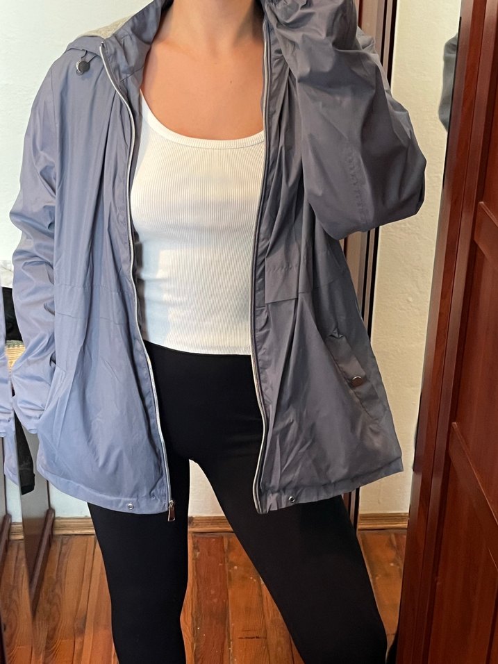 Rahat kesimli, yüksek yakalı ve uzun kollu gri midi kadın ceket. Pürüzsüz sentetik kumaştan, günlük sokak stiline uygun.