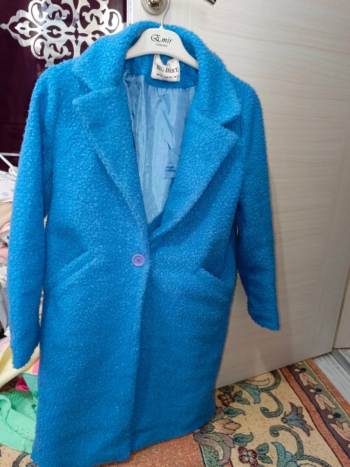 Mavi renk, düğmeli, normal boy midi uzunlukta kadın kabanı. Uzun kollu, rahat kesim ve yumuşak, sıcak kumaştan üretilmiştir. bukle kumaş çok iyi durumda yeni gibi