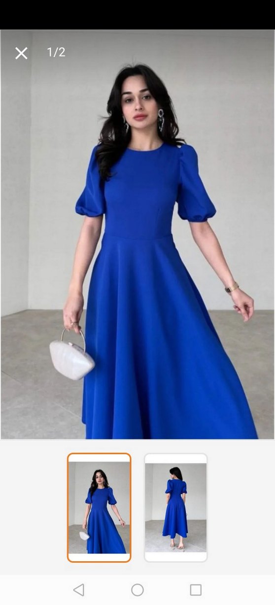 Mavi uzun elbise, yuvarlak yaka ve kısa kollu. Salaş kesimi ve parlak, desensiz yapısıyla, ipeksi kumaştan üretilmiş. Düğünler için zahmetsiz şıklık sunar.