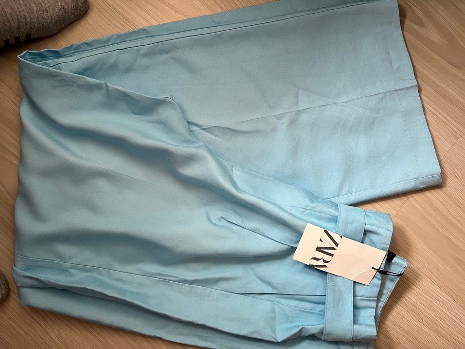 Mavi renkte, midi boy, kadın kumaş pantolon. İpek gibi yumuşak kumaştan, normal kesim ve fermuarlı detaylı. Minimalist, normcore tarzda günlük kullanım için uygun.