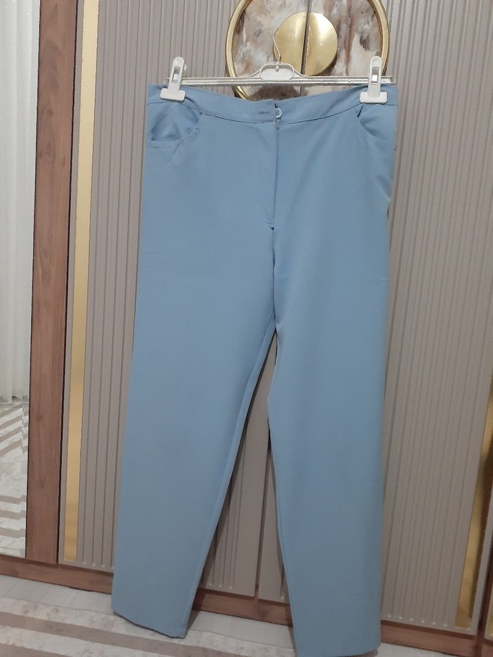 Mavi midi uzunlukta kadın kumaş pantolon, regular fit ve yumuşak sentetik kumaşla ofis için rahat ve şık bir görünüm sunar.