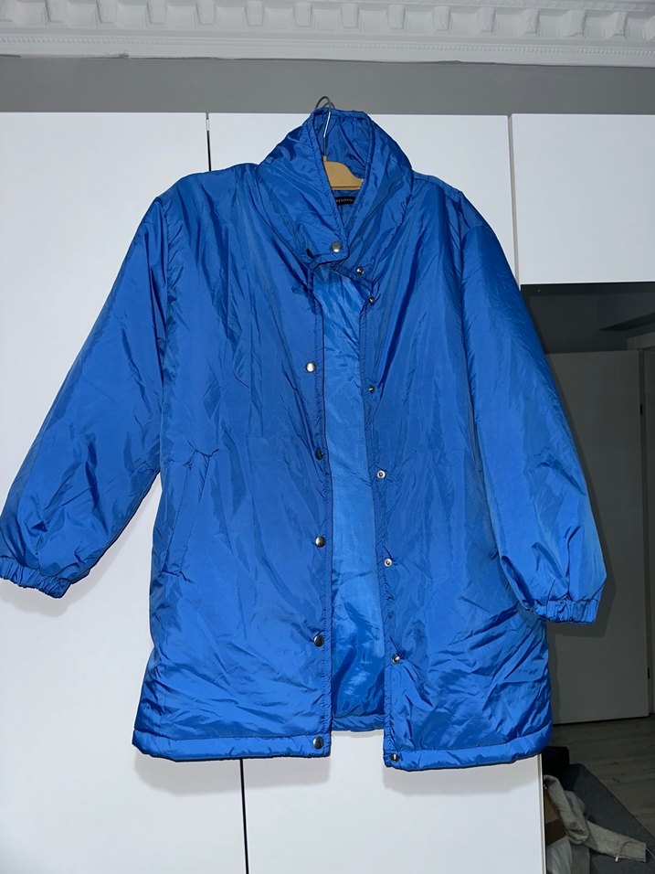 Düğmeli, yakalı ve uzun kollu bu mavi ceket, bol kesimi ve parlak dokusuyla sokak stili için uygundur. Rahat ve sıcak kumaştan yapılmıştır.