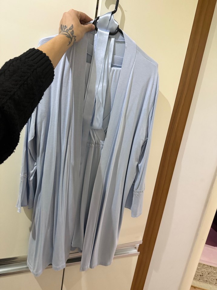 Mavi renkte, salaş kesim midi uzunlukta, uzun kollu sabahlık. Minimalist ve streetwear tarzında, desensiz sade tasarıma sahiptir. Sıfır ürün doğumda giymek için alındı giyilmedi 4 parça