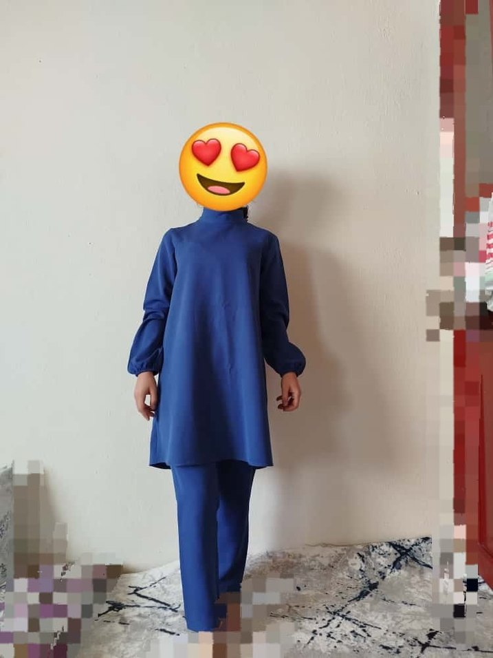 Mavi, yüksek yakalı ve uzun kollu midi kadın takımı. Normal kesim, renkli batik desenli, günlük rahat şıklık sunar.