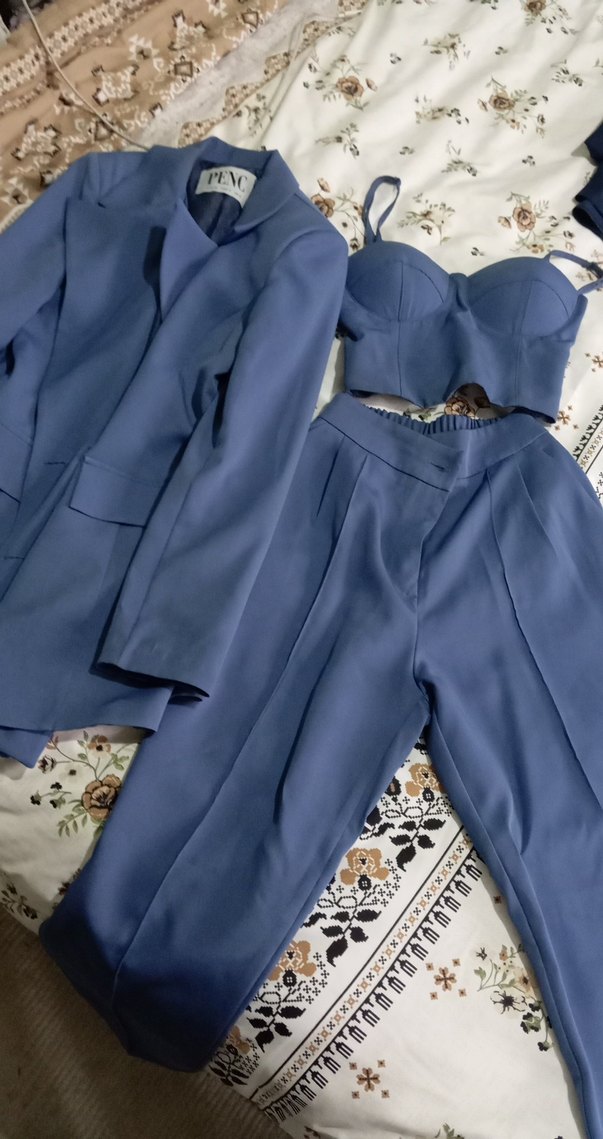 Mavi renkte, notched lapel yakalı, regular fit ceket ve pileli midi boy pantolon ile strappy üstten oluşan kadın takımı. Sentetik kumaştan, pastel ve desensiz, ofis için uygun.