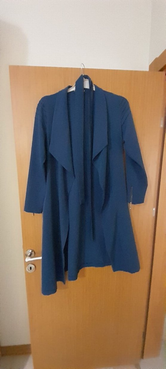 Bu koyu mavi kadın kaban, kesik yakalı ve drapeli tasarıma sahip, uzun kollu ve rahat kesimdir, ofis kullanımı için uygundur. temizdir. 42 bedene de uyumlu bol kalıp . kemerlidir.